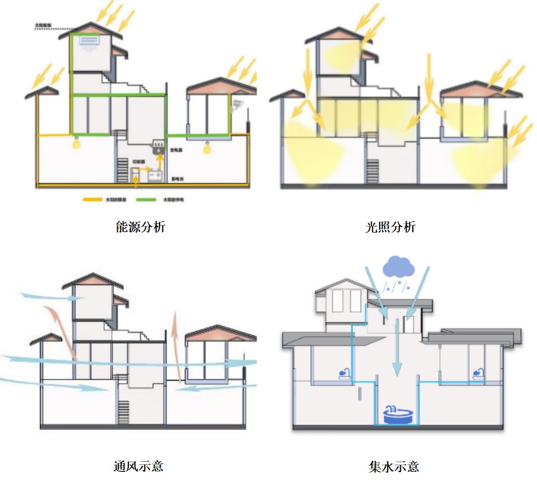 綠建理念融入設計細節,光能上,采用可開合光伏發電板,發揮聚能優勢;通風上,環廊和天井的利用,做到 “室內室外可通透,地上地下可循環?!奔希醒胩炀到y發揮集水功能,通過管道設計將雨水回收利用。