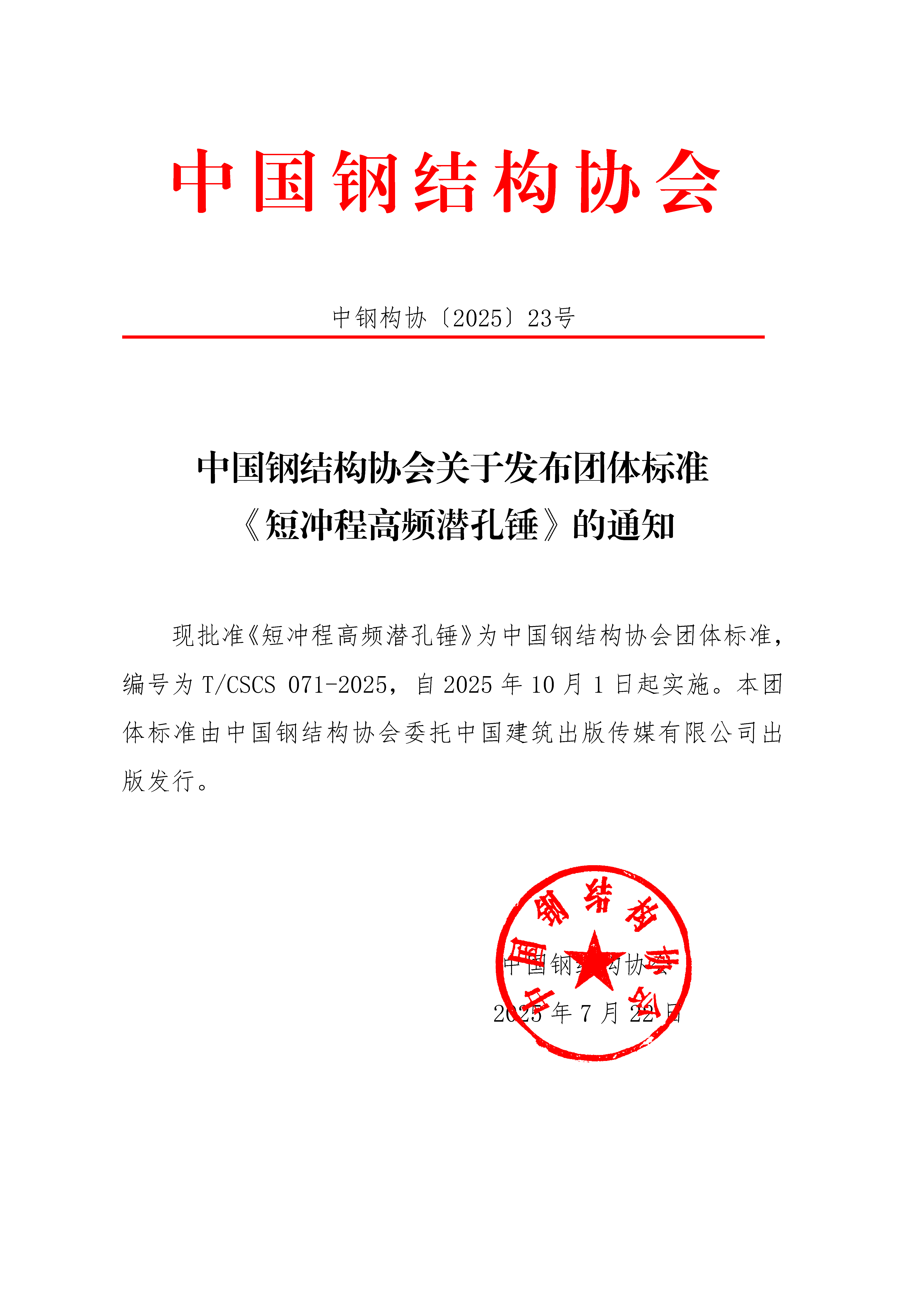 中國鋼結構協會關于發布團體標準《短沖程高頻潛孔錘》的通知
